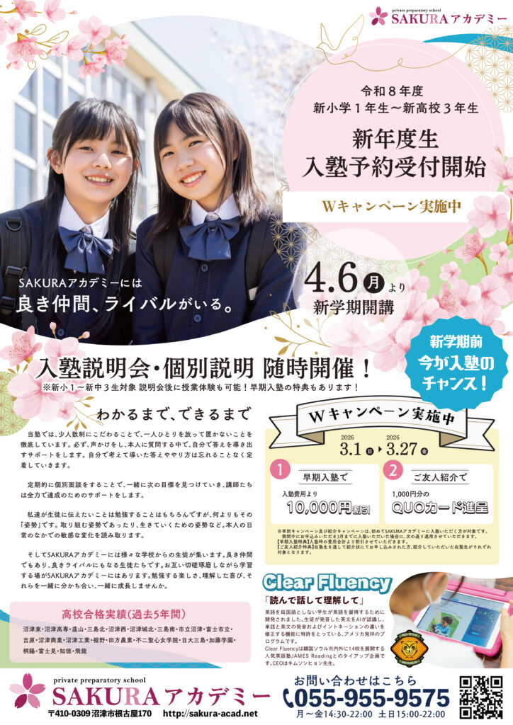 ◆令和8年度新入塾生 まだまだ受付中! SAKURAアカデミーでは新入塾生をまだまだ受付してます「Wキャンペーン」も第三弾継続中!新学期前にお得に入塾できる最後のチャンス!!キャンペーンは3月27日(金)まで興味のある方はお急ぎご連絡くださいお問い合わせは、TEL:055-955-9575 まで j-sugiyama 2026-02-28T17:09:16+09:00 3月 1st, 2026|